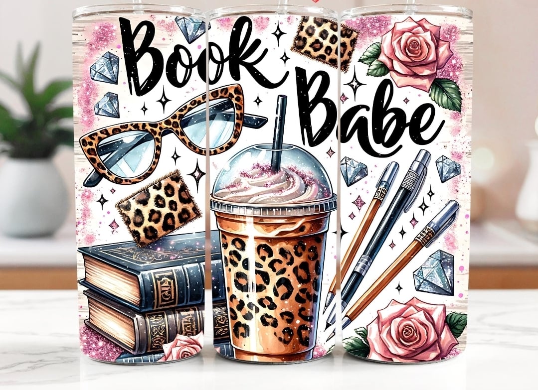 A glam reader’s dream! This “Book Babe” tumbler features stacked novels, chic leopard sunglasses, sparkling diamonds, pink roses, stylish pens, and a trendy leopard iced coffee design. Perfect for book lovers who enjoy a little sparkle with their stories. 📚✨