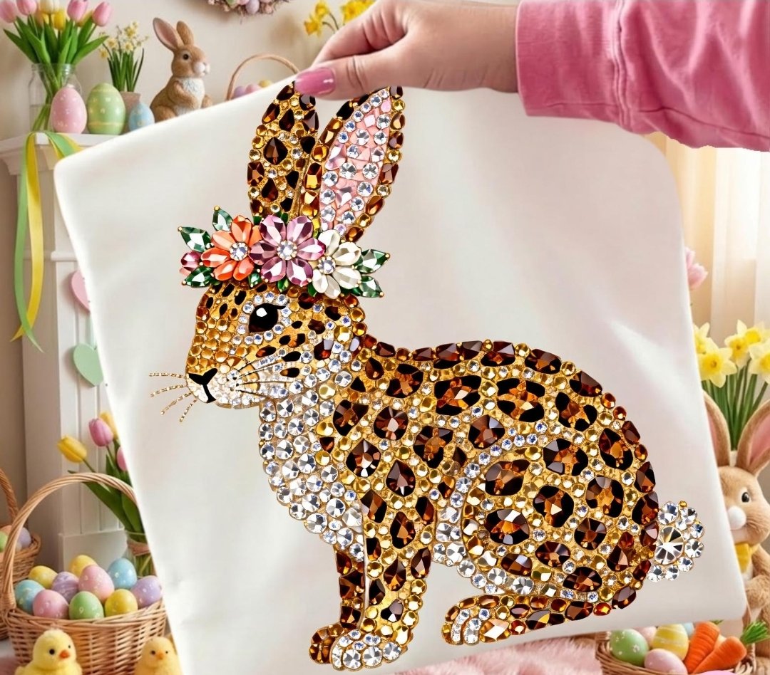 A dazzling rhinestone bunny adorned in leopard-print crystals and sparkling gems, topped with a floral jeweled crown. This luxe Easter-inspired design blends glam sparkle with spring charm—perfect for a boutique statement tee or festive holiday collection. ✨🐰🌸