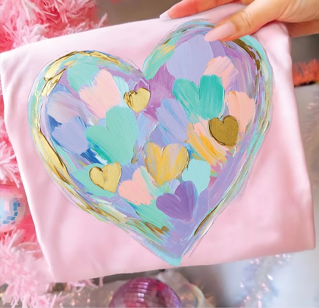 A hand-painted pastel heart filled with soft brushstroke hues of lavender, mint, blush, and sky blue, accented with shimmering gold hearts and metallic edging. A sweet, artsy design that feels playful, romantic, and boutique-ready for spring or Valentine collections. 💕✨