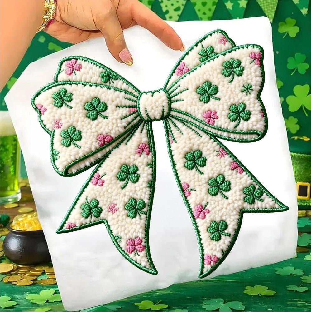 Festive St. Patrick’s Day bow design featuring textured chenille-style fabric with embroidered shamrocks and pink floral accents — a cute and cozy lucky statement piece.